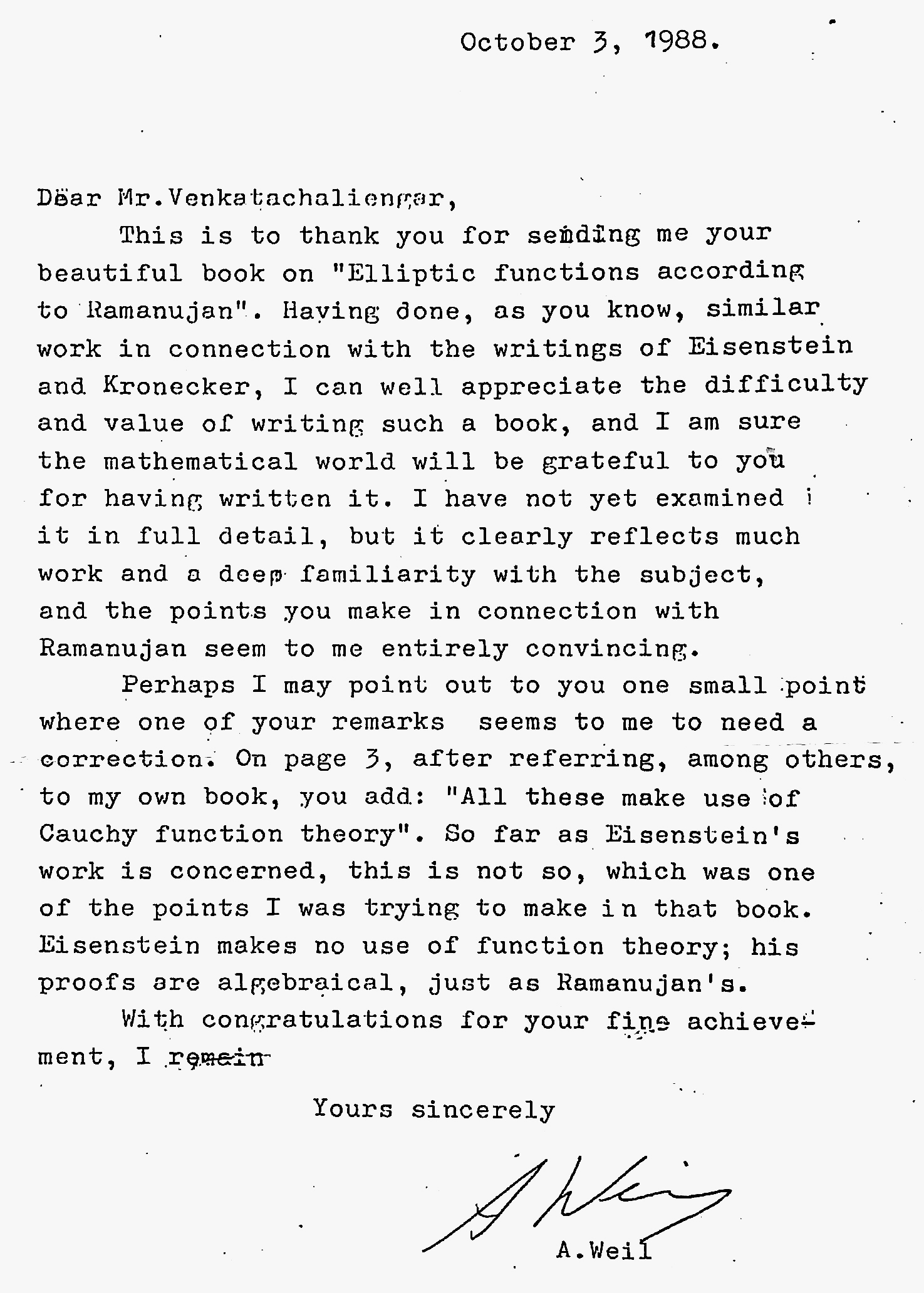 Letter from André Weil appreciating the work of K. Venkatachaliengar. courtesy: Shaun Cooper