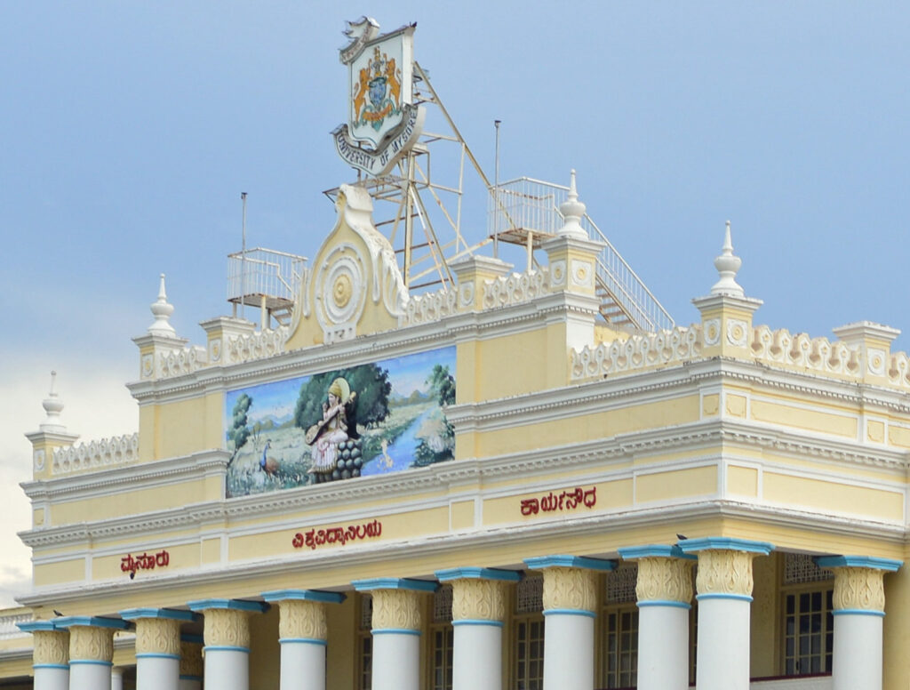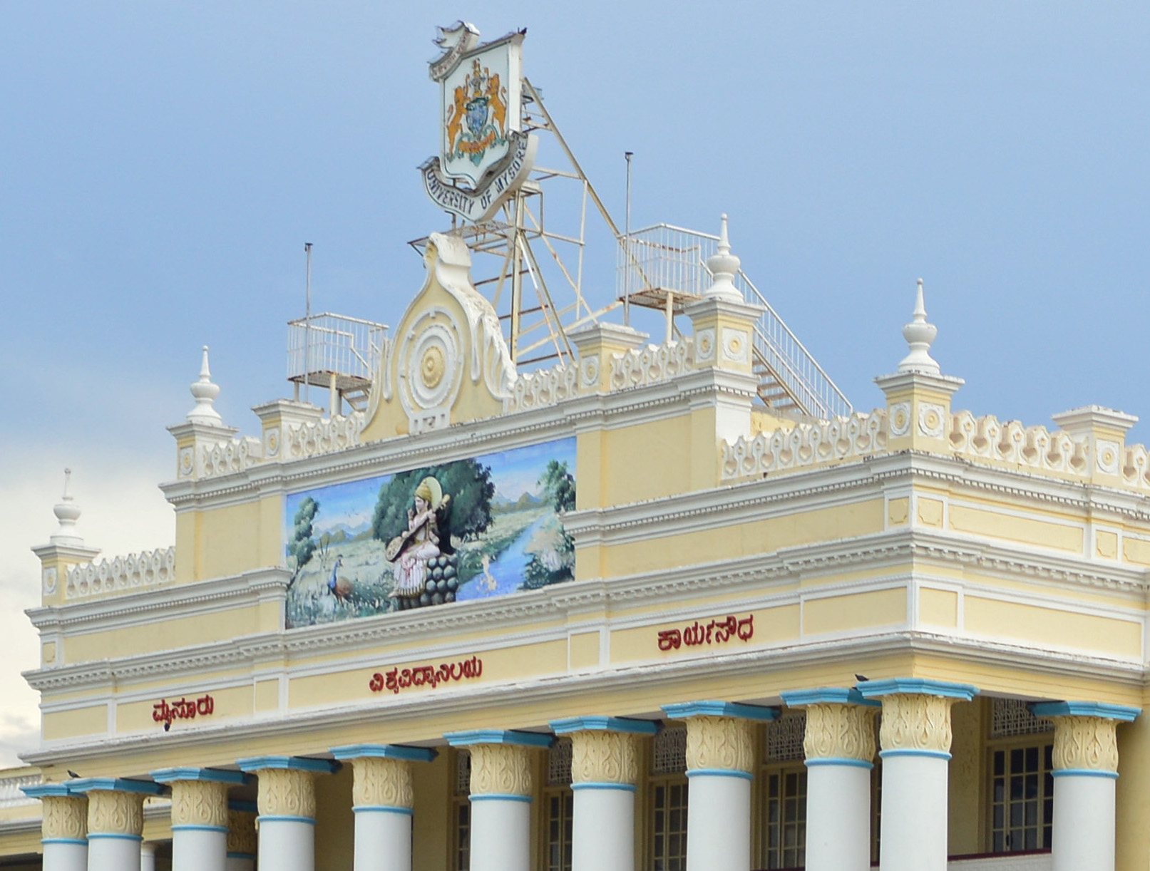 Crest of the Karyasoudha building, the administrative headquarters of the University of Mysore, showing the university emblem and an embossed image of Saraswati playing the veena. Wikimedia Commons