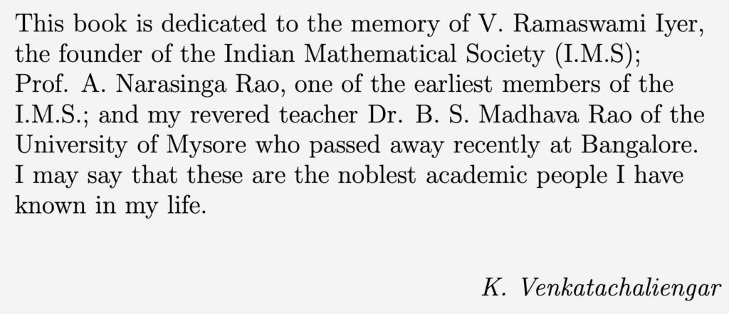 Born on December 8, 1908, in a modest village, Kadaba, located about sixty kilometres northwest of Bangalore, academic trail of K. Venkatachaliengar is marked by a high degree of excellence in scholarship and teaching, and an absolute dedication to mathematics.