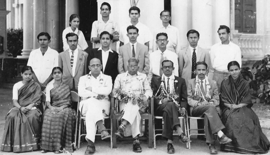 Group photo of the 1963 Final year MSc batch. V. Ramamani is seated second, and Venkatachaliengar is in the middle. V. Ramamani