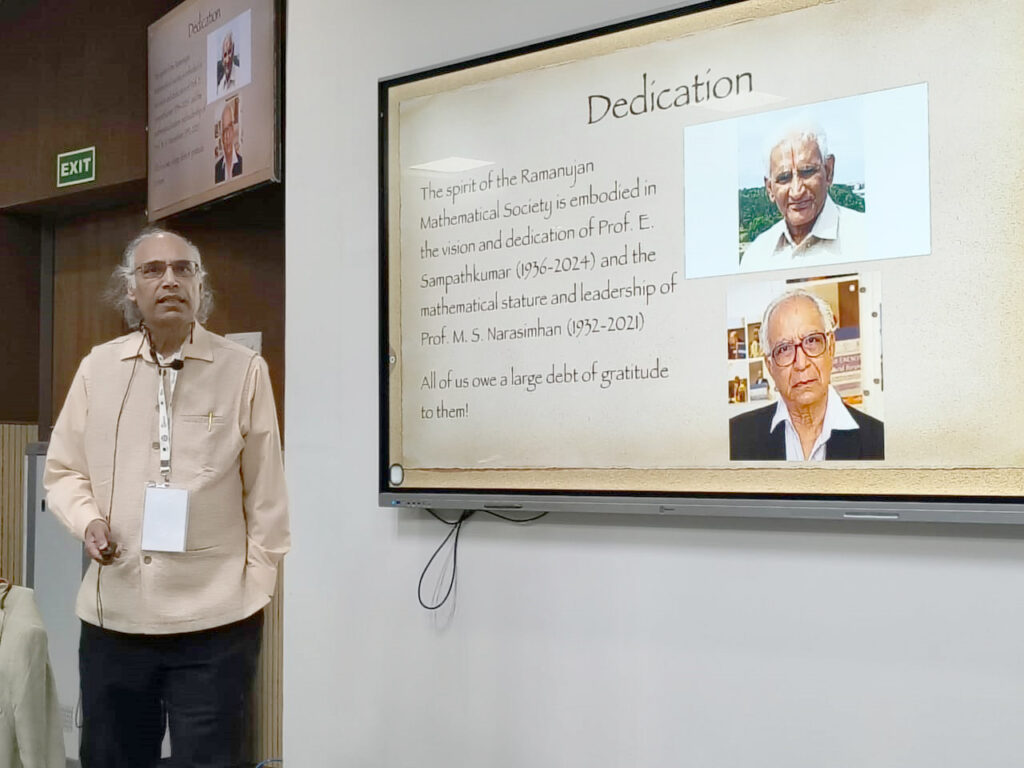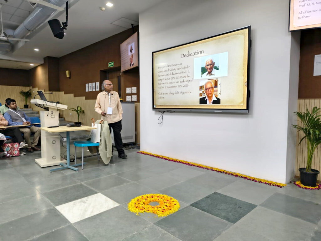 V. Kumar Murty in his plenary address at the 2025 annual conference of the RMS, displaying the statement of Dedication. Kotyada Srinivas